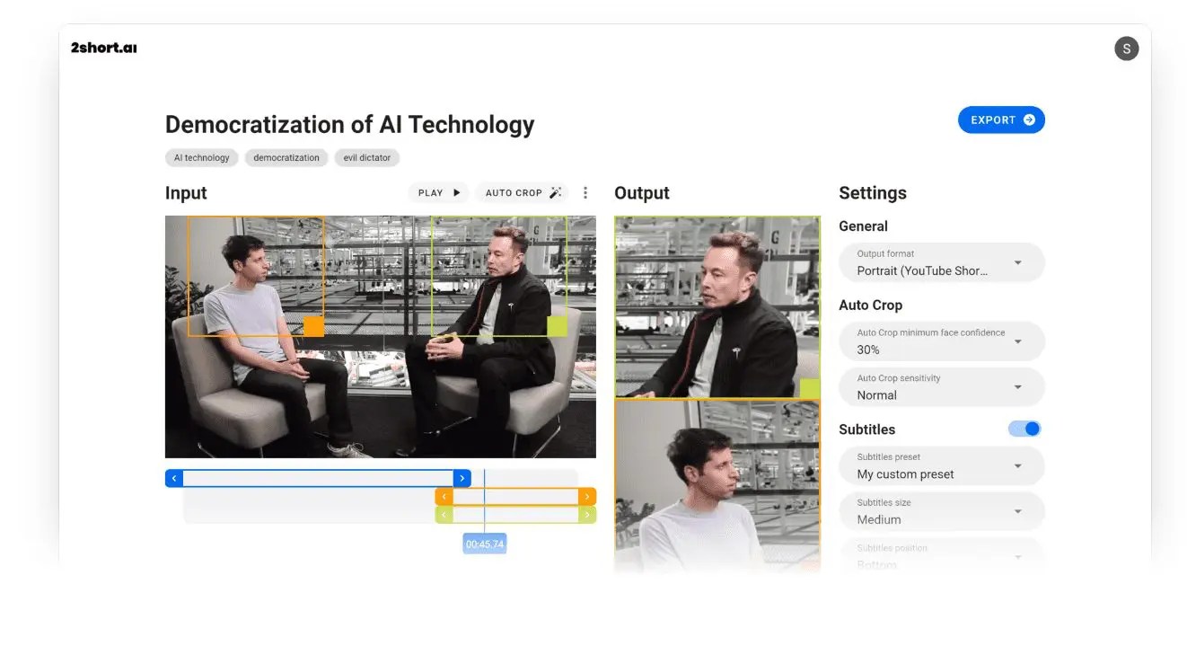 2short.ai is an AI-powered tool that helps content creators convert long-form content into shorter, engaging videos that drive views and subscribers. It simplifies the video editing process, allowing creators to focus on producing more content and expanding their reach.